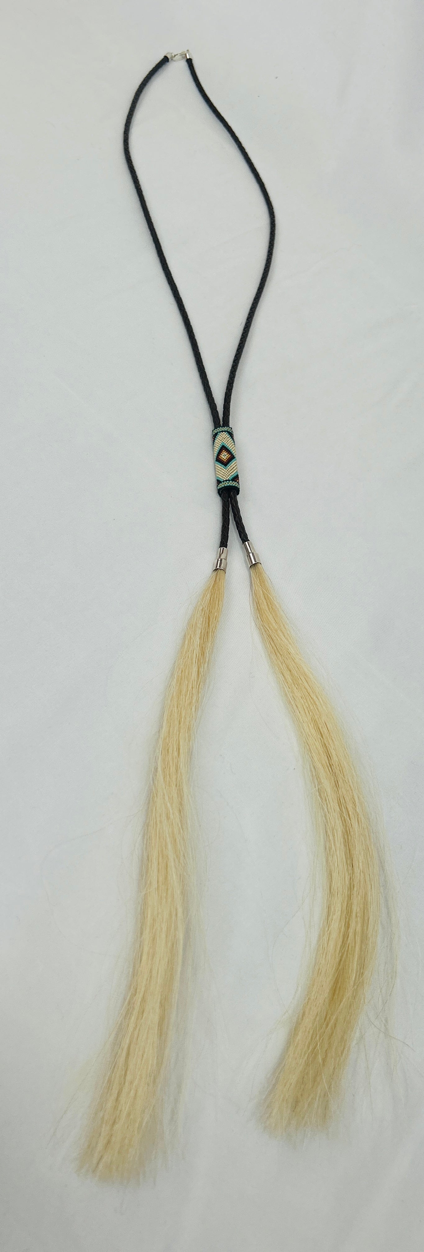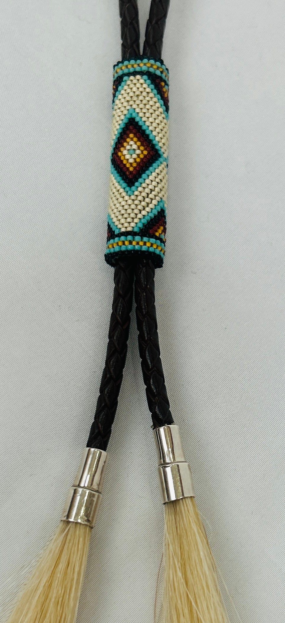 This striking bolo tie combines traditional craftsmanship with refined materials. Hand-beaded detailing adorns a brown braided leather slide, while genuine horsehair fills the cording for authentic texture and movement. Sterling silver open tips frame the design, adding a polished finish to this statement accessory. Perfect for Western wear, formal occasions, or adding character to everyday outfits, this piece showcases meticulous artisanal work and quality construction.