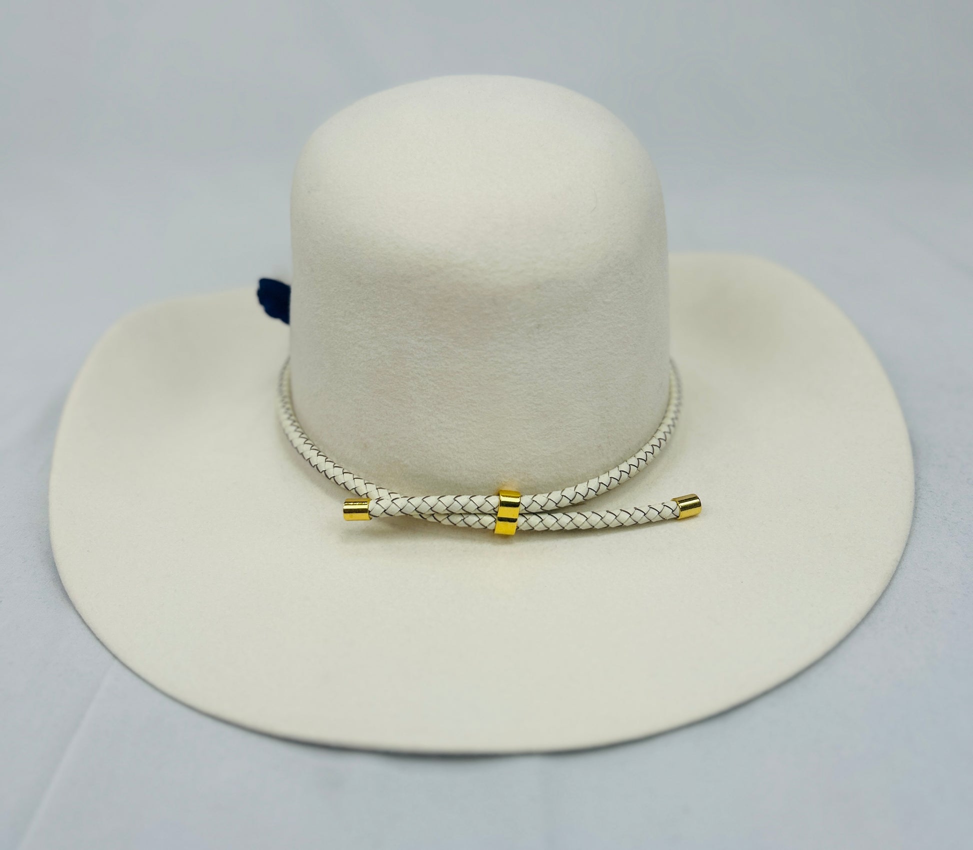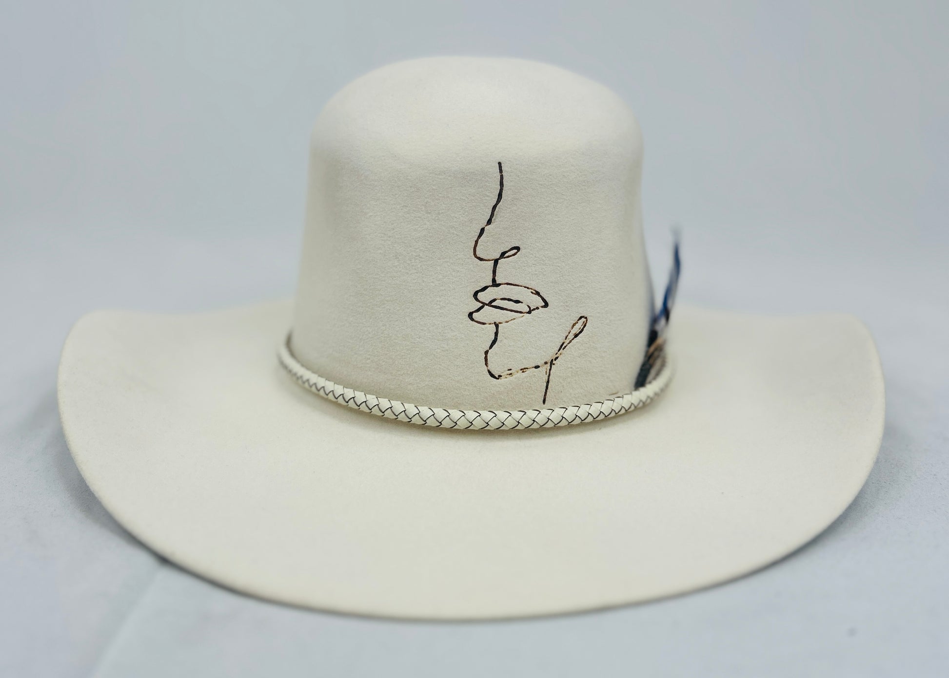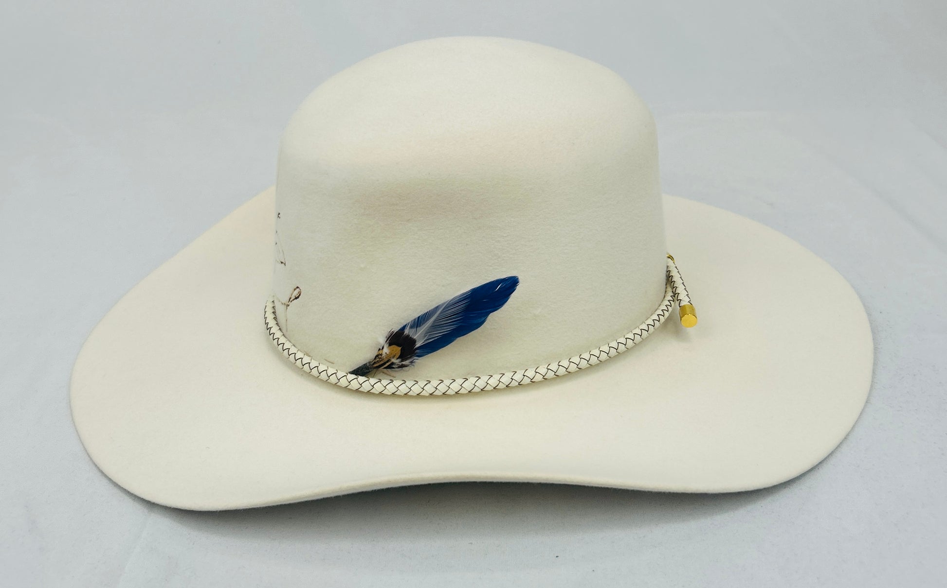 purple feather adornment. Custom silk lining and tan lambskin sweatband