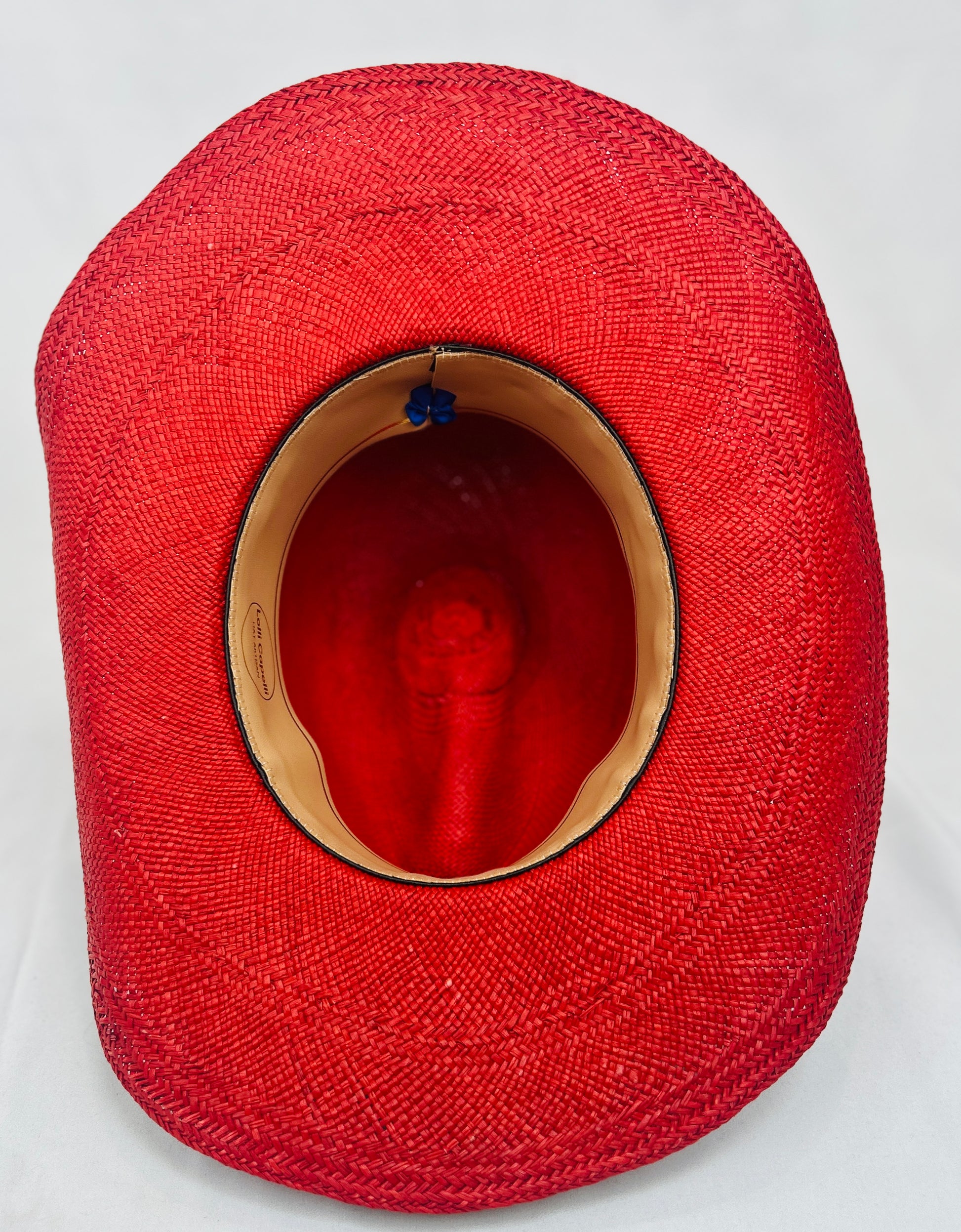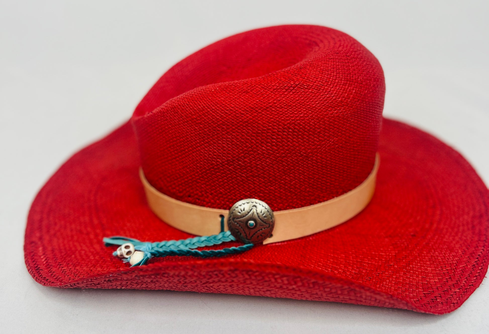 Red straw western style hat with light brown leather band. Silver Conch button with turquoise ties and skulls.