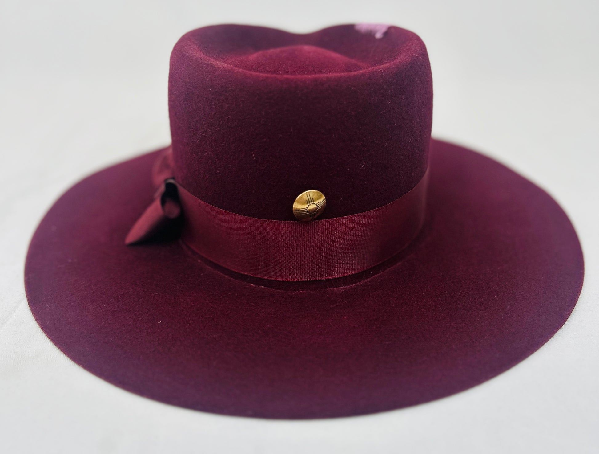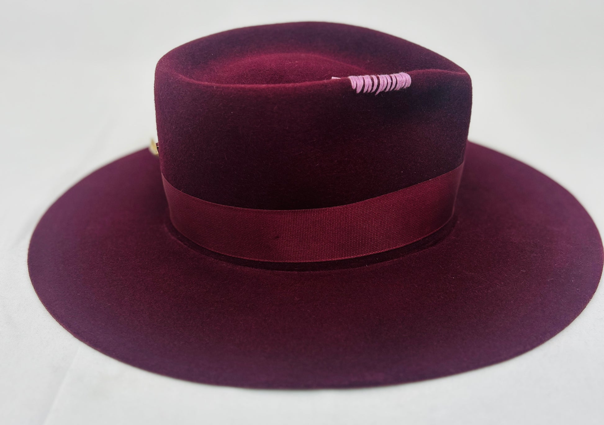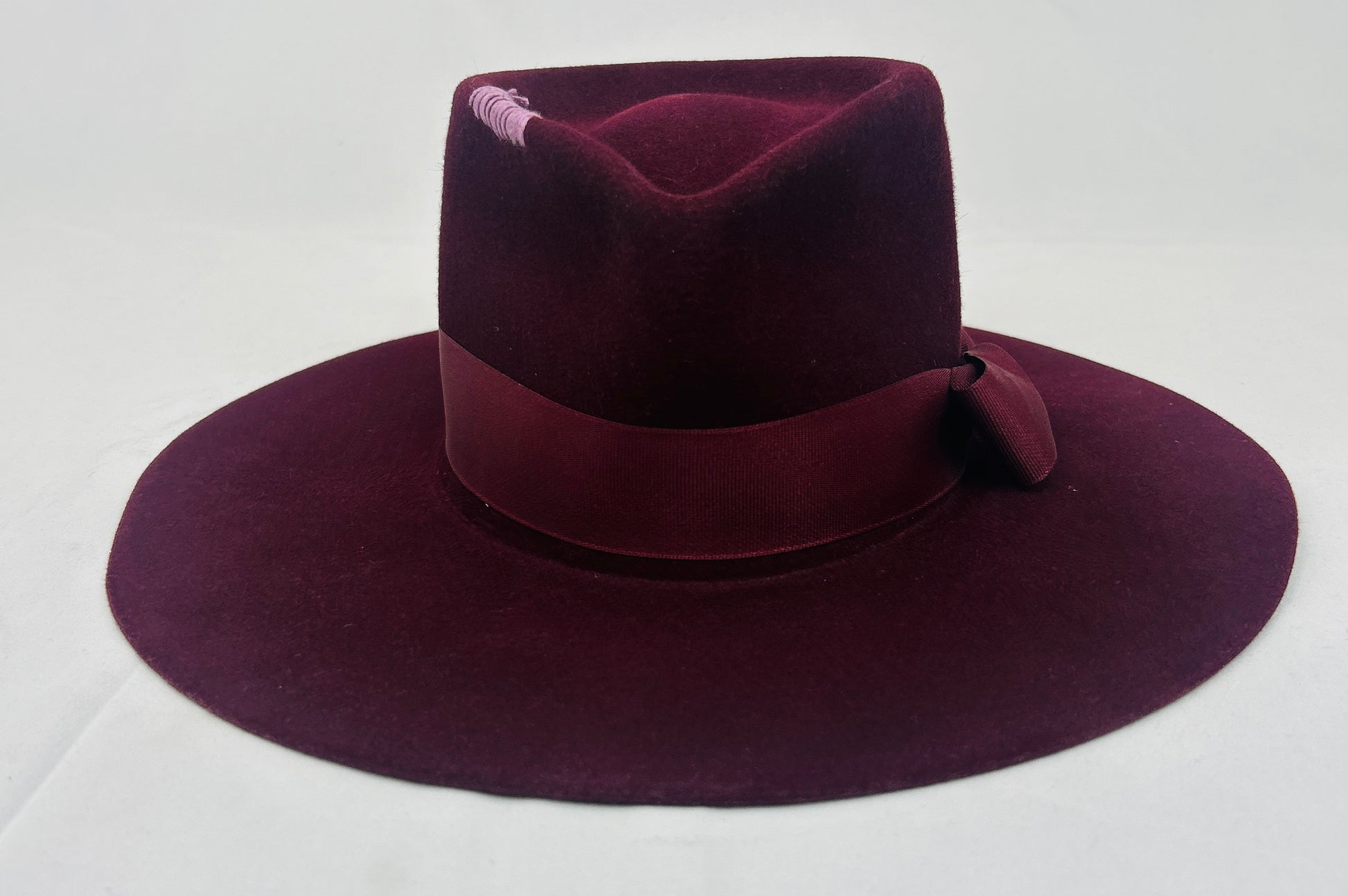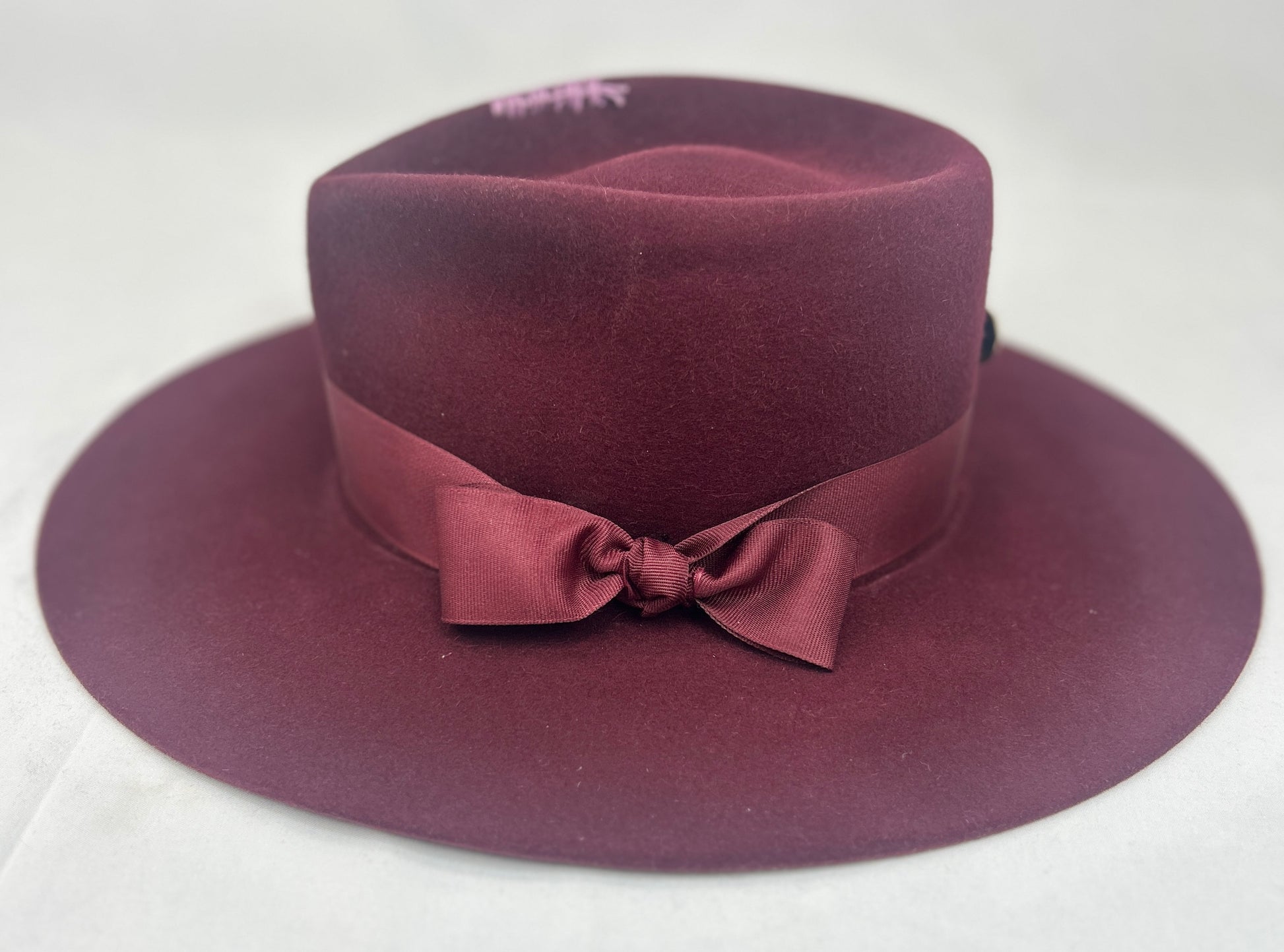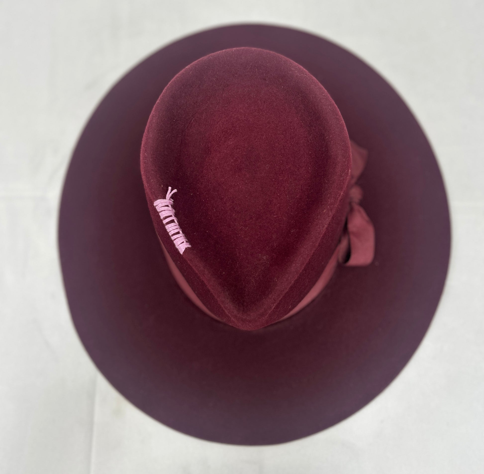 Fur felt Burgundy fedora. Perfectly styled with same color bow and ribbon band, Gold button on back. Lavender stitching on crown. 4 inch flat brim