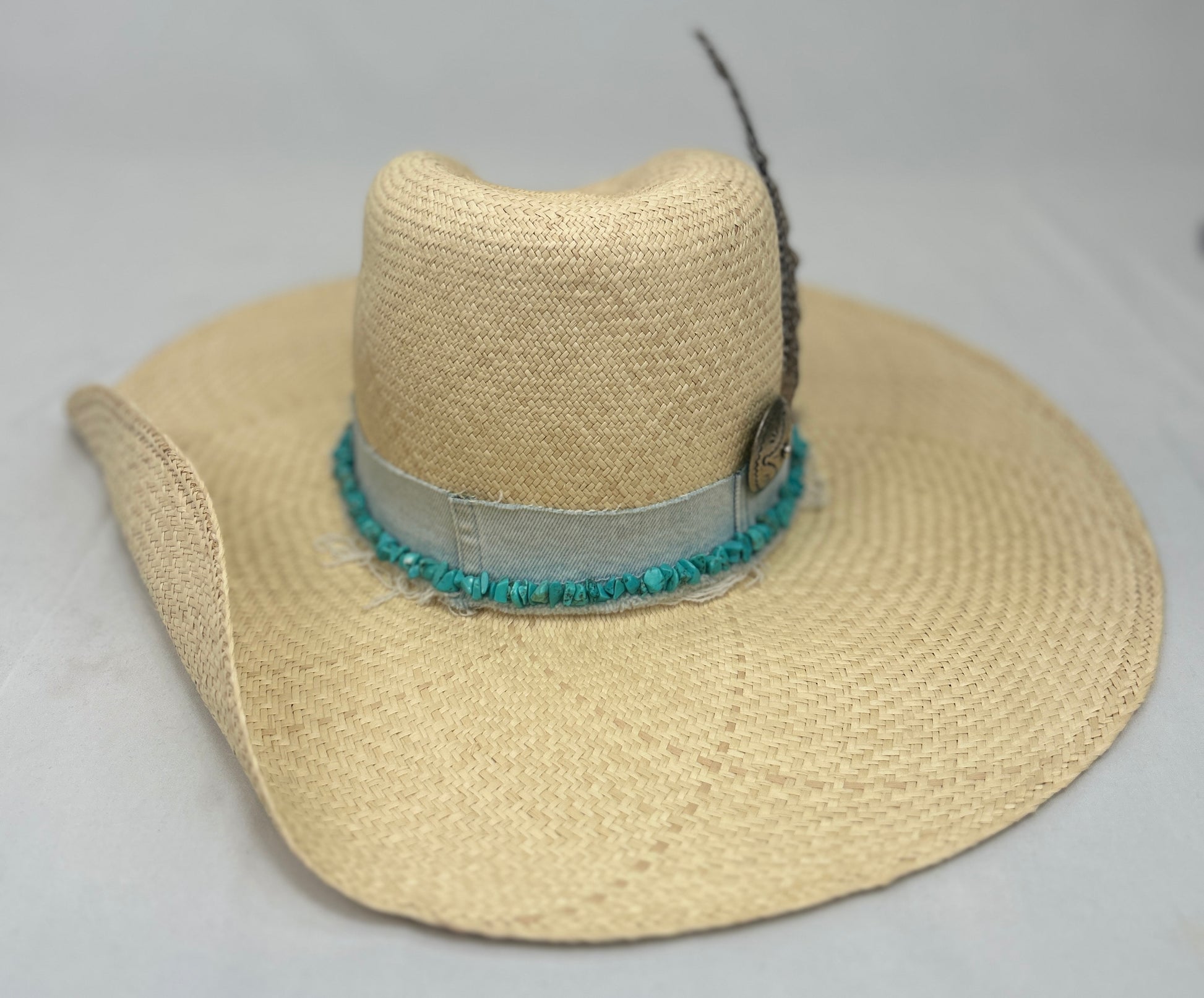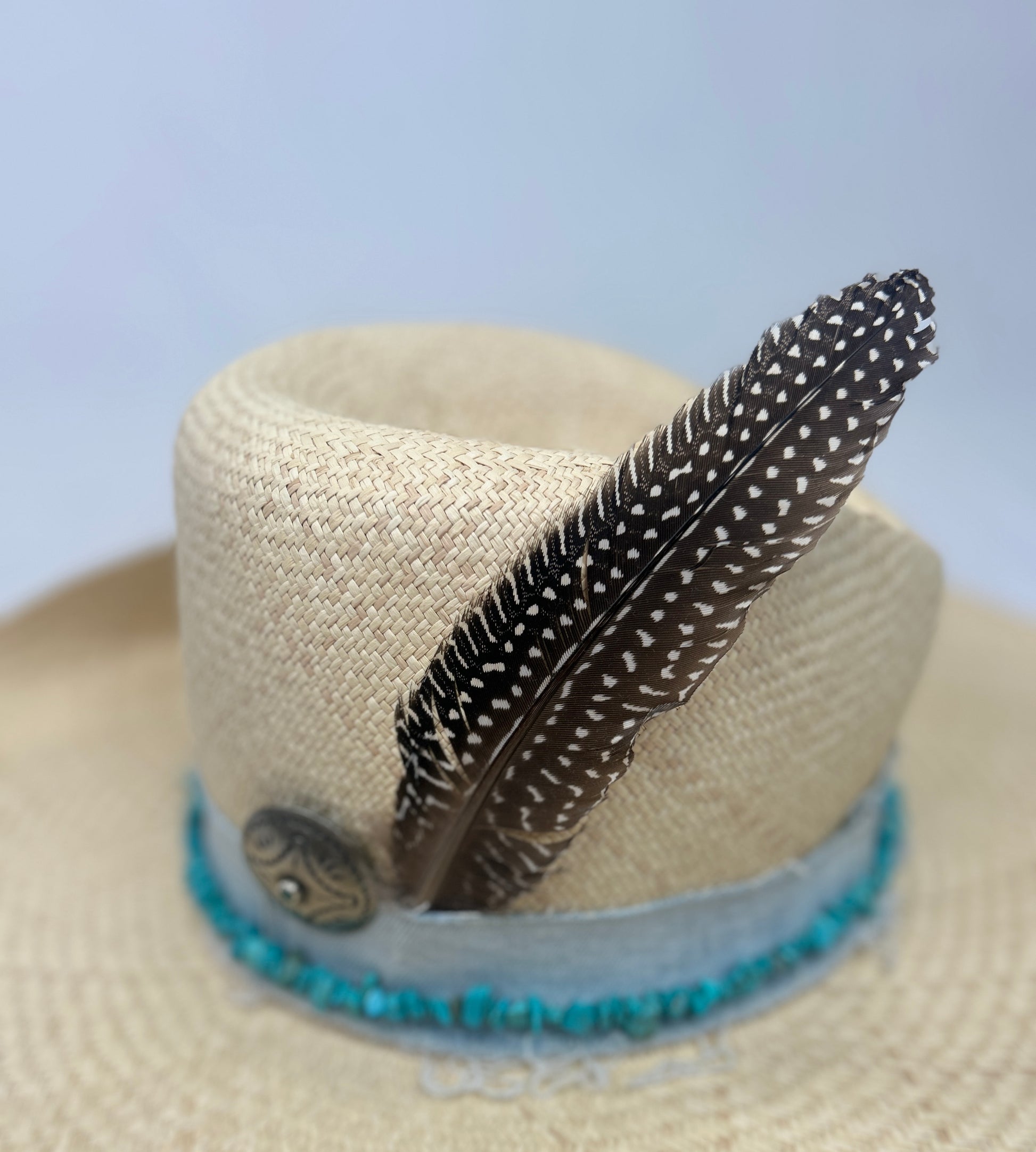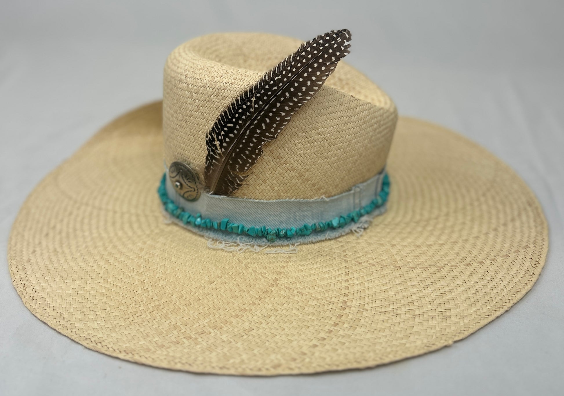 Straw large brim hat with a unique style. Denim band with turquoise and silver button and feather.