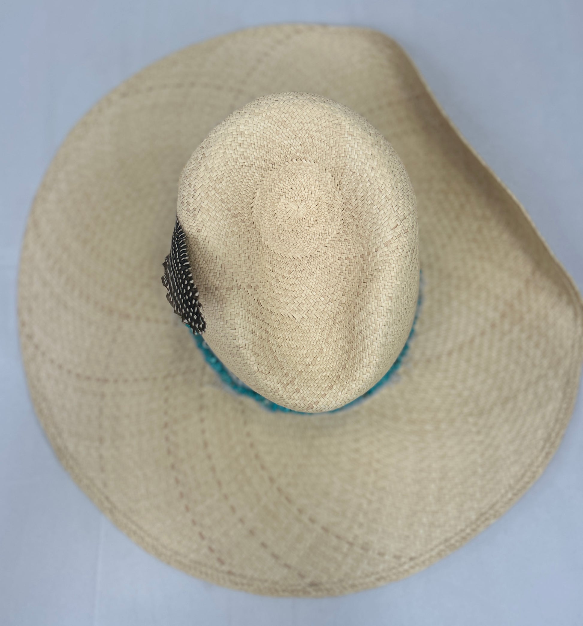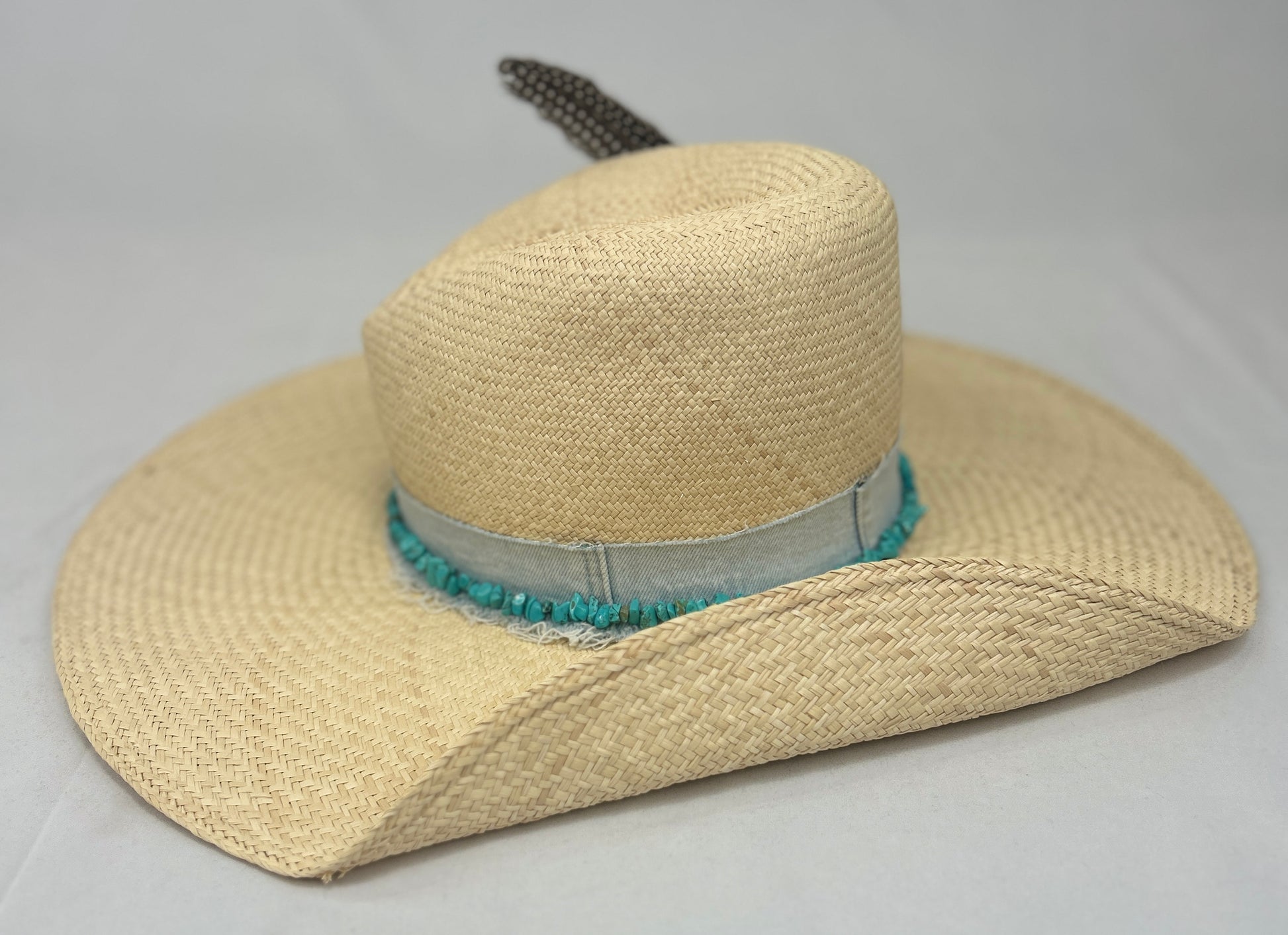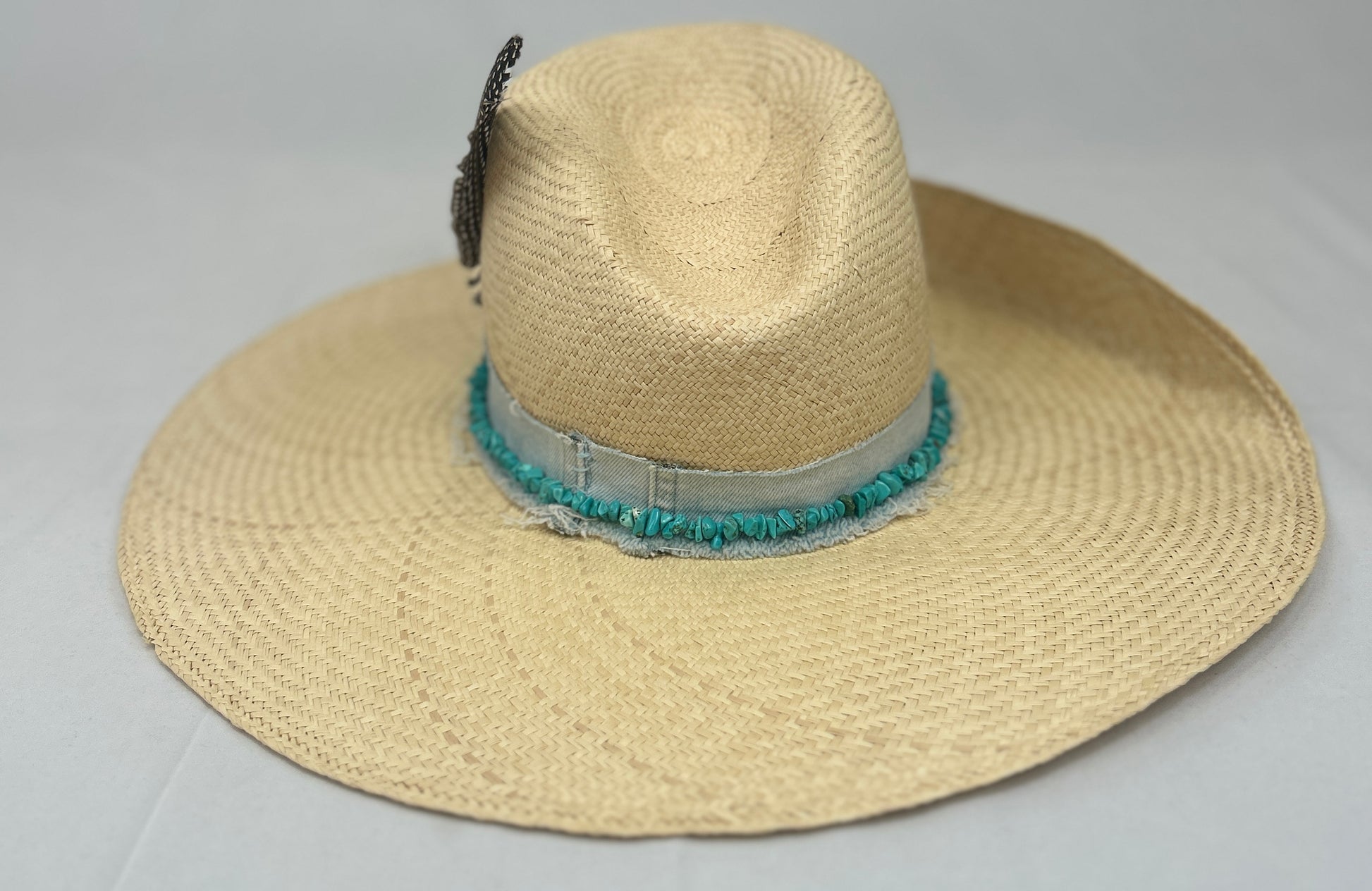 Straw large brim hat with a unique style. Denim band with turquoise and silver button and feather.