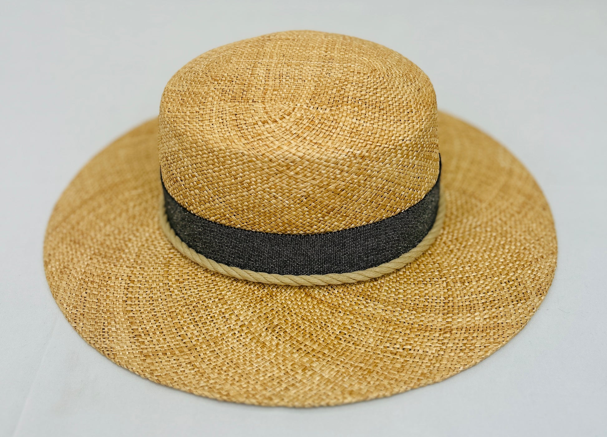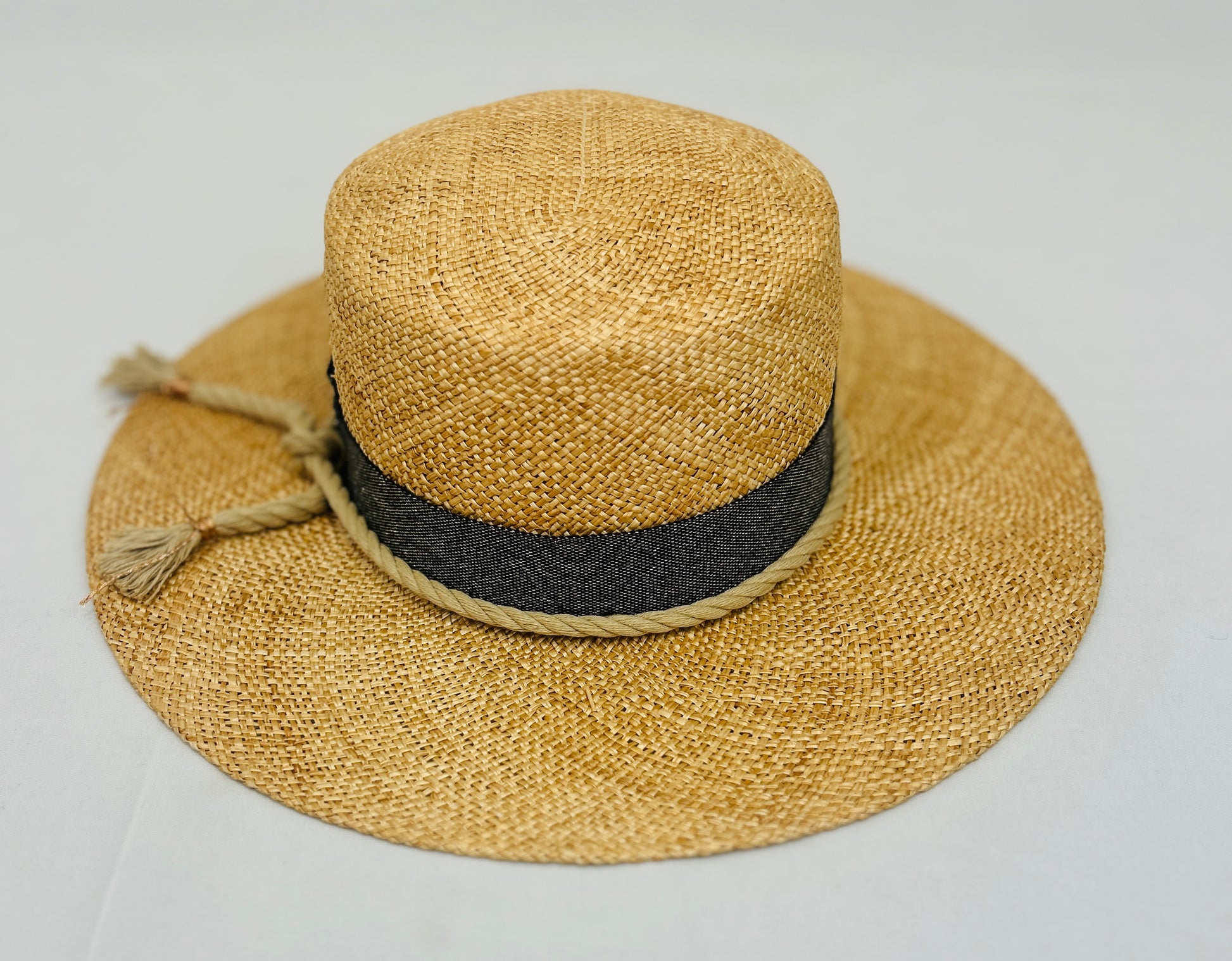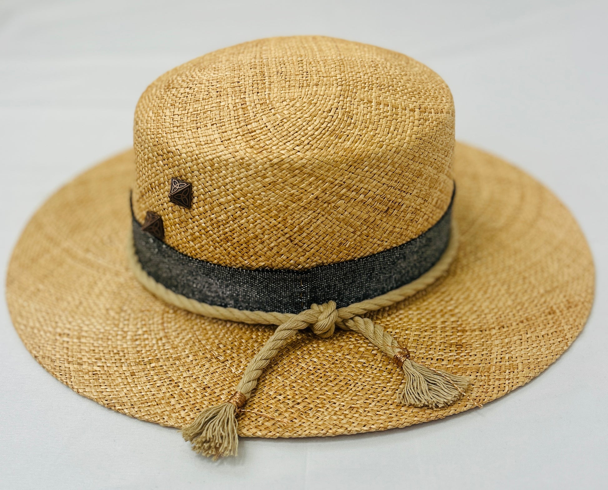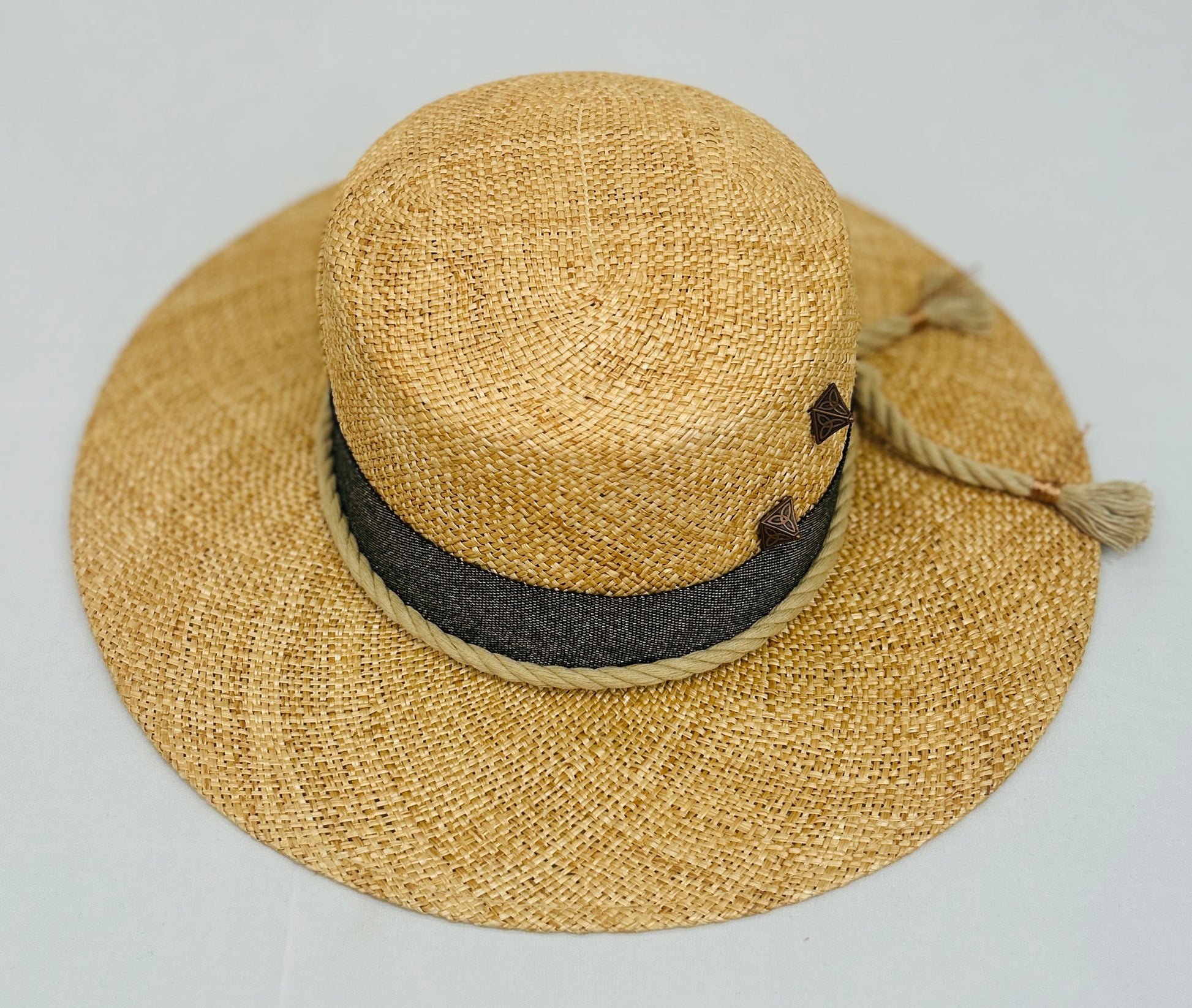 Very lightweight straw hat the metallic band layered with rope and metallic thread